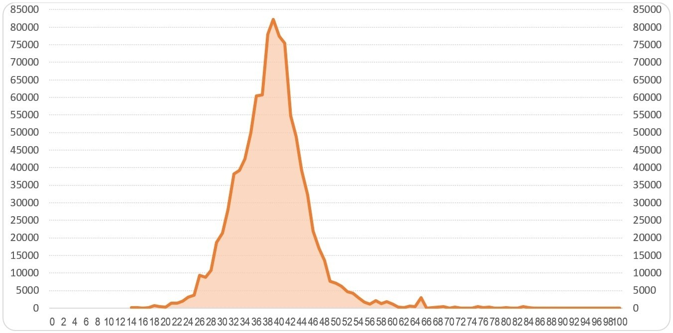 График 2. Распределение явки по числу поданных голосов (шаг 1% явки, округление явки вниз)