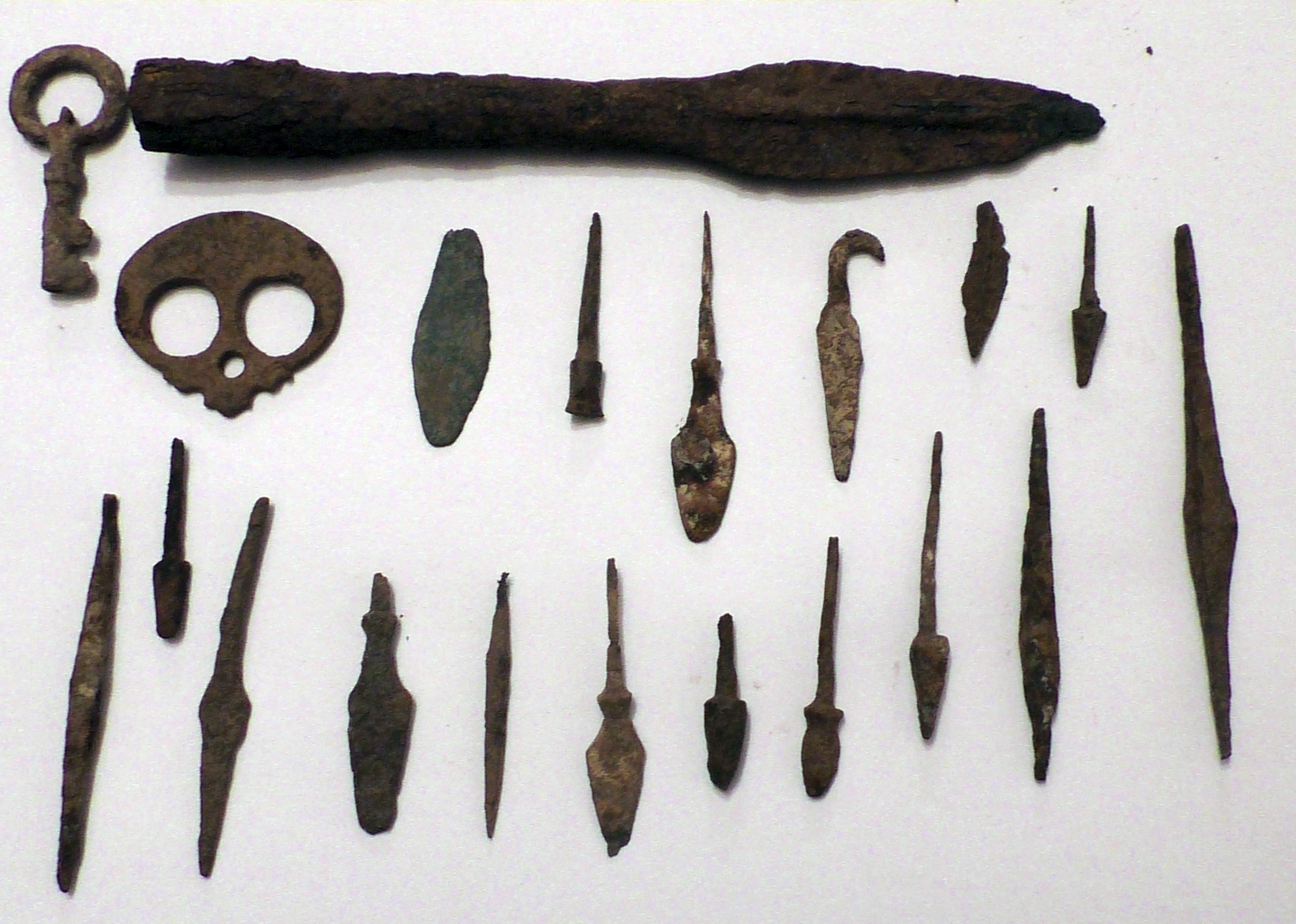 Наконечник копья очень интересен. Вправо от "черепа" (что за железный "черепок" - я не знаю, деталь от чего-то) бронзовый наконечник, он у Эрика единственный бронзовый, остальные наконечники железные.