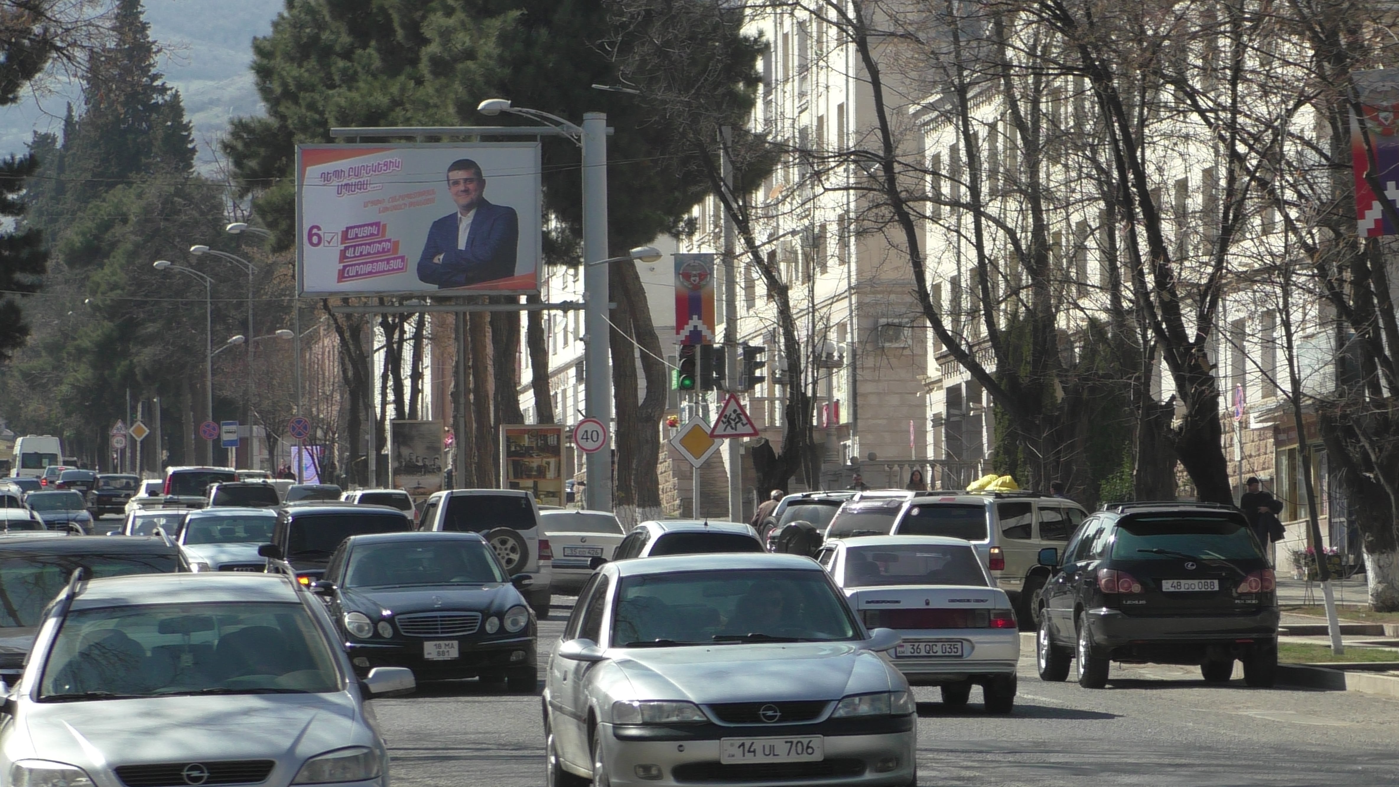 Больше всех денег у Араика Арутюняна, соответственно его плакат самый большой. Это рядом с вокзалом. Наши таксисты в своем большинстве за него, верят, что он станет президентом и улучшит жизнь всех жителей Арцаха. Интересно, если вдруг станет президентом, вспомнит ли о таксистах?