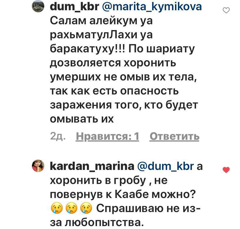 Между тем, жителям  республики стало известно о том, что в соседней КЧР вопрос с купанием и заворачиванием в  саван умерших от коронавируса проводится организованно. Договоренность между  местным Роспотребнадзором  и муфтиятом  Карачаево-Черкесии по этому вопросу была достигнута еще в марте месяце. ДУМ передает в морг белый материал, зеленое покрывало и жидкое туалетное мыло в отдельных упаковках -  для мужчин и для женщин.  Санитары в защитных костюмах купают и заворачивают в саван, и  только после этого одевается пакет. Как заверяет представитель ДУМ Ибрагим Катчиев ни один усопший не остался без омовения.