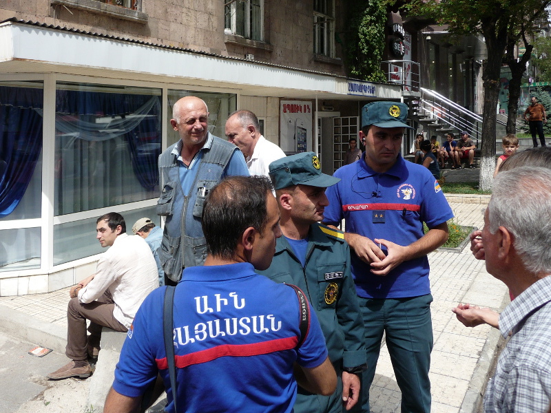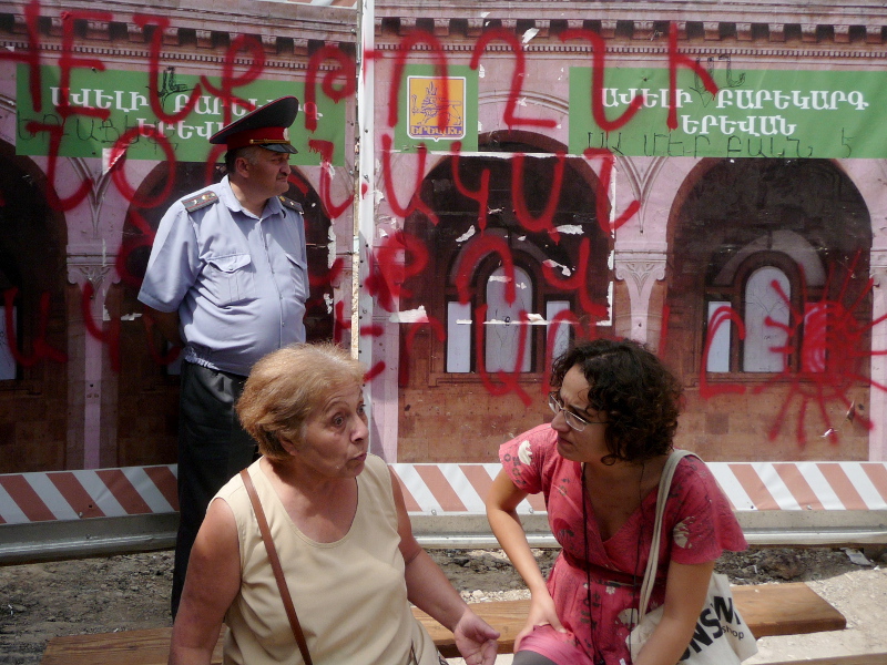 Нелли Восканян, жительница дома №5 по улице Комитаса (слева), беседует с активистами.