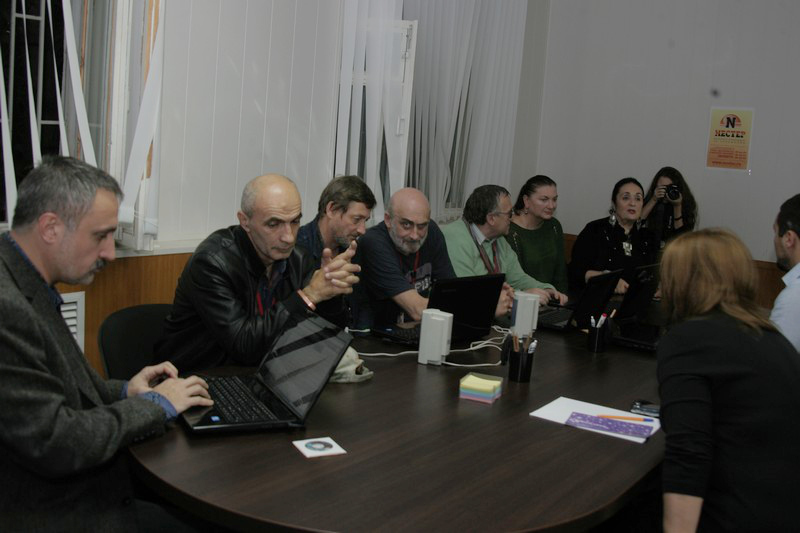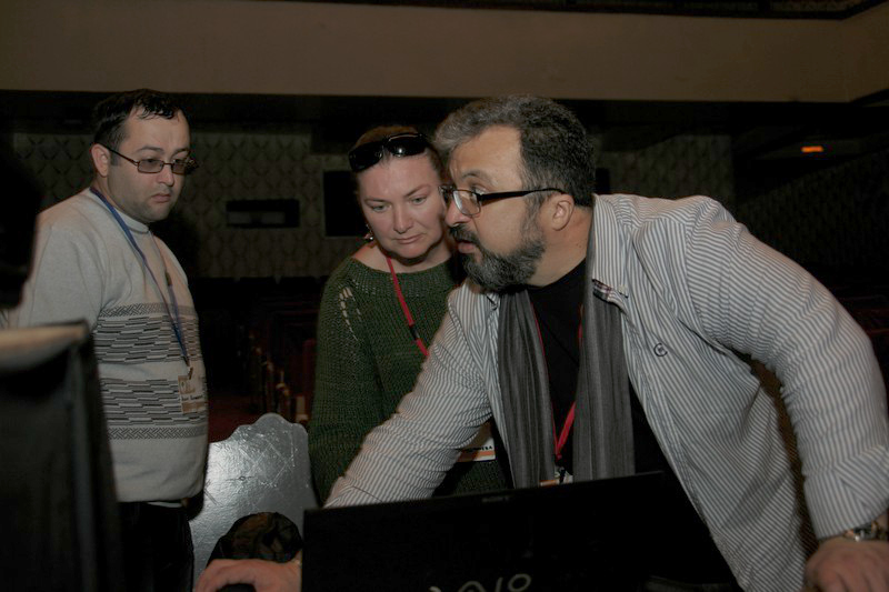Подготовка к показу внеконкурсных фильмов на спортивную тематику. Справа - кинокритик Индира Черджиева и директор фестиваля, кинодокументалист Ильяс Богатырев.