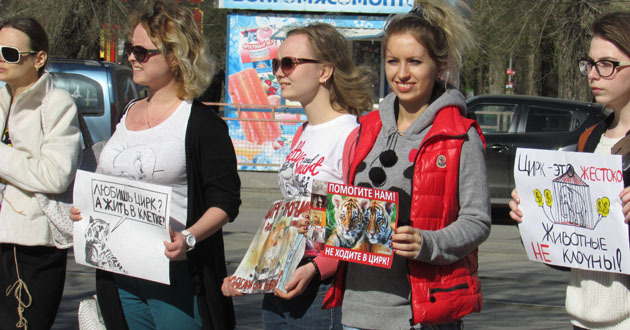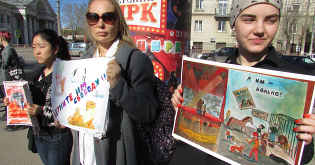 Активисты держали в руках плакаты «Любишь цирк? А жить в клетке!», «Цирк – тюрьма», «Помогите нам, не ходите в цирк», «Цирк – это жестоко. Животные – не клоуны», «Вам весело, а им больно»