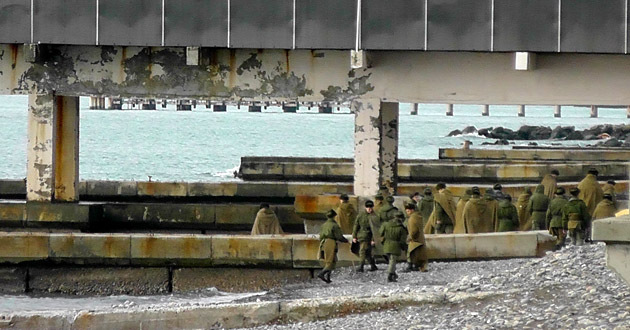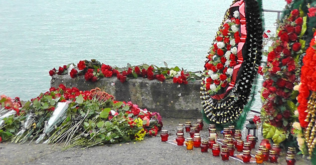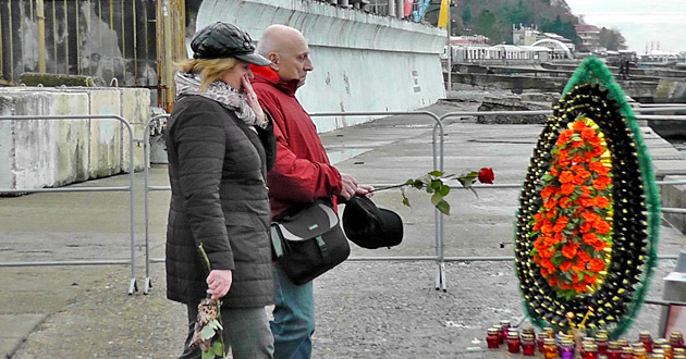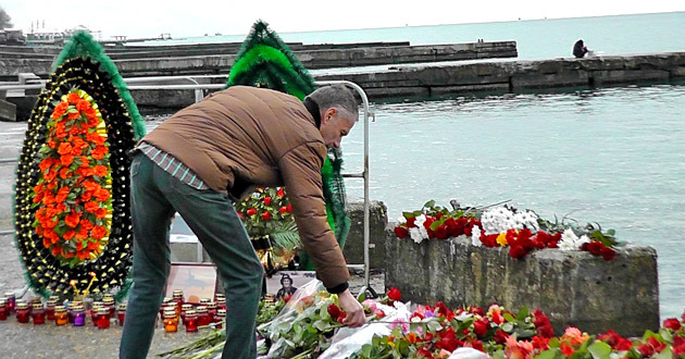 Цветы к набережной на Южном моле Сочинского морского порта начали приносить вчера днем, после того, как стало известно о крушении самолета министерства обороны РФ в сочинской акватории Черного моря. Сегодня это место стало официальным мемориалом памяти жертв трагедии, люди с самого утра идут постоянным потоком, приносят живые цветы в надежде, что кто-то найдется живым, и зажигают свечи в память о погибших. Пложадь у Южного мола уже украсили к празднику, экран, на котором планировалось транслировать праздничные ролики, затягивают черной траурной тканью. Отменен предновогодний концерт симфонического оркестра имени Рахманинова, вместо него в здании Морского порта пройдет вечер памяти жертв авиакатастрофы над Черным морем. После возложения цветов к мемориалу люди долго смотрят в море, где продолжаются поисковые работы. Солдаты-срочники прочесывают берег Черного моря в поисках обломков, которые могут быть принесены волной.