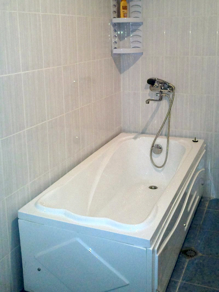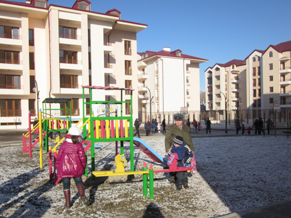 Детская площадка перед зданием, выделенным для семей военнослужащих.